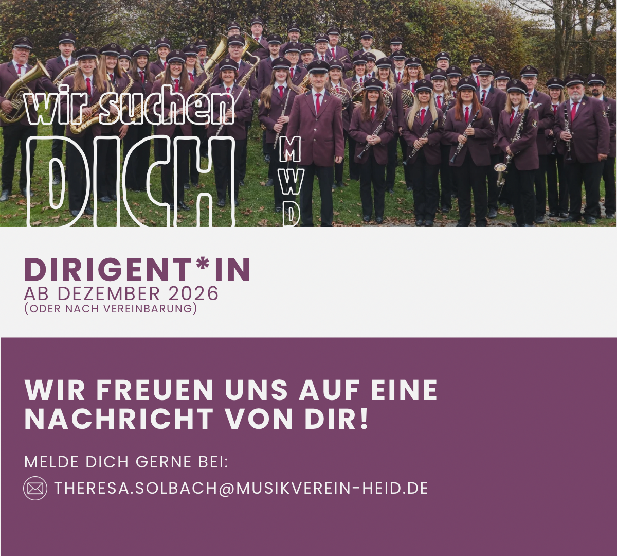 Mit einem weinenden und einem lachenden Auge blicken wir in die Zukunft und begeben uns auf die Suche nach einer neuen Dirigentin oder einem neuen Dirigenten, der oder die unseren Verein mit Freude und Engagement weiterführt.